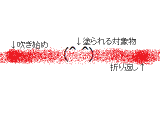 塗装の素人が塗装のコツを説明するなど差し出がましいですが、一助になればと思い記しておきます。右図(クリックで拡大)をご覧下さい。塗る対象物に対して塗料を噴霧しながらスプレー缶を左から右、右から左へと移動を繰り返していくと、塗られる塗料は図のようになります。吹き始め(左)と折り返し(右)に吹きかけられる塗料の量が多くなり、これが塗装ムラの原因となります。ですので、図のように吹き始めと折り返しの塗料の噴霧は対象物には当てずに塗装をすると、薄く均等に塗装することができます。後は左右にスプレー缶を振る速度で塗料の噴霧が対象物に当たる量を調整します。