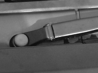 マスキングが終わったらワイパーアームの取り外し作業に移ります。ワイパーアーム下部の付け根にある丸いゴムのキャップを指でつまんで外すと六角ナット(使用するレンチのサイズ12mm)が現れますのでレンチなどを使用して外します。レンチがナットにアクセスできない場合はボンネットを開けて作業します。ナットは経年によりかなり錆びていると思いますので、潤滑剤(CRC556)などをスプレーするとよいでしょう。場所が場所だけにそれなりの工具を使用しないと、工具でボンネットなどに傷を付ける可能性が高いので注意しましょう。私の場合は他に適切な工具がなかったため、短いメガネレンチでナットを外しましたが、これはあまりお勧めできないやり方です。長さや角度の合ったメガネレンチやラチェットレンチがベストかもしれません。
