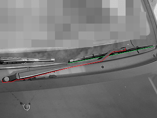 このページでは、左画像(クリックで拡大)のワイパーの赤線部分をワイパーアーム、緑線部分をワイパーブレードと呼んで説明しています。