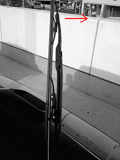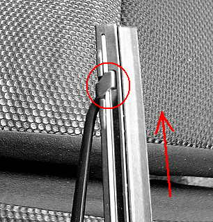④ワイパーブレードのツメを押さえながらブレード全体を矢印の方向に移動させるとワイパーの支柱(ワイパーアーム)からブレードだけが外れます。