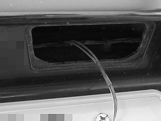 まず、車体後部のナンバープレートがついているバンパーの上部を下から覗いてみるとナンバー灯のユニットが2つ付いています。これらはツメで引っかかっているだけなので簡単に外せます。電線が接続されているので、外すと画像のようにぶら下がります。